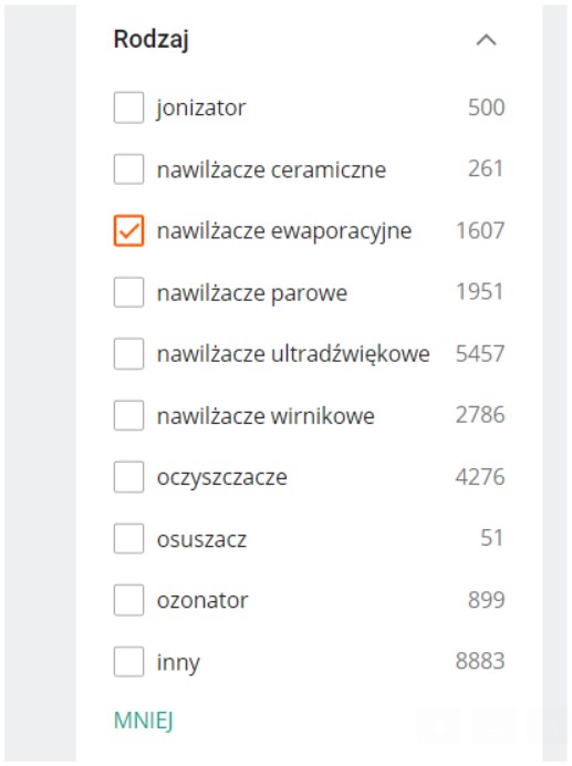 Jak już wspomnieliśmy, nawilżacze ultradźwiękowe są najpopularniejsze na Allegro, ale w serwisie tym nie brakuje też bezpiecznych nawilżaczy ewaporacyjnych. Aby je wyszukać, trzeba w bocznym menu zaznaczyć rodzaj „nawilżacze ewaporacyjne”.